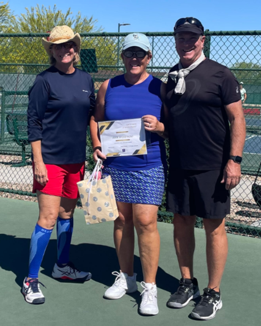 Joan Wickstrom (middle) receiving a special thank you certificate and a goodie bag for completing 100 lessons with GQ PICKLEBALL. “SNAP PICKLEBALL” Instructor Kathy Palese (left) and “GQ PICKLEBALL” Instructor Gary Quantz (right) on hand to celebrate this momentous occasion.